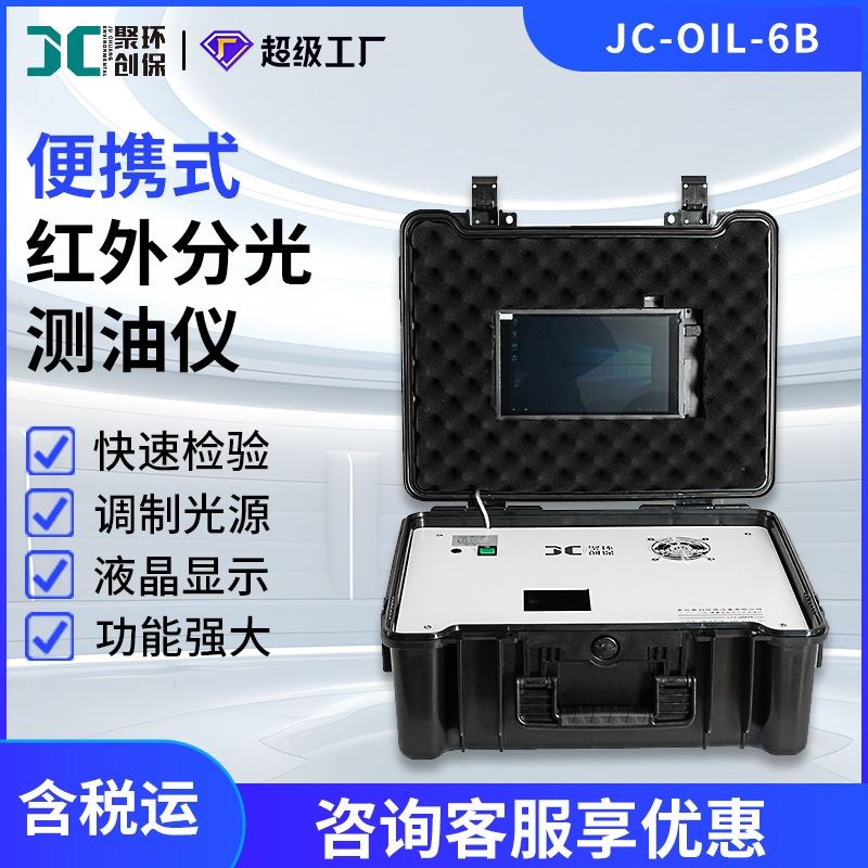 JC-OIL-6B型便携式红外分光测油仪,满足新国标,可野外检测,内置的平板电脑采用微软系统,可脱离外部电脑独立工作。针对地下水、地表水、生活污水和工业废水中石油类和动植物油含量及餐饮业油烟浓度的测定及检测。